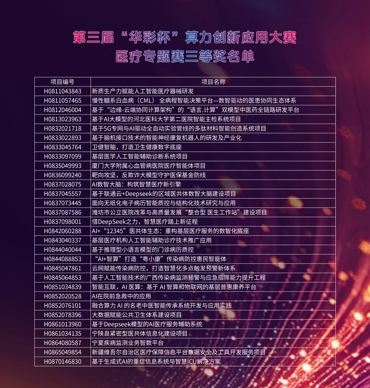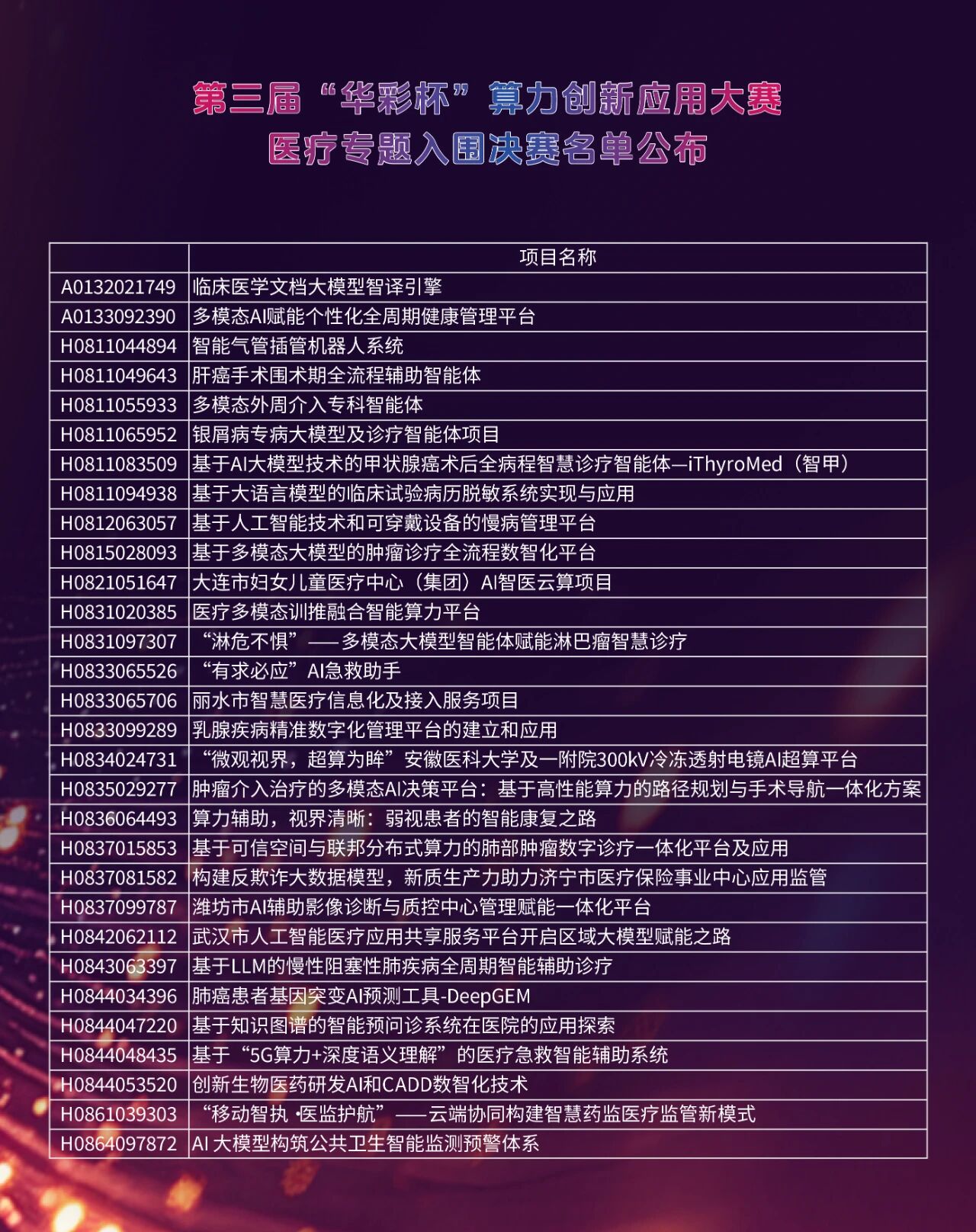 经过大赛组委会资格审查、内容筛查及初赛专家评审,确定30个项目入围决赛,角逐一等奖、二等奖,30个项目获得三等奖。现将第三届“华彩杯”算力创新应用大赛医疗专题赛入围决赛及三等奖名单公布如下:(排名不分先后)