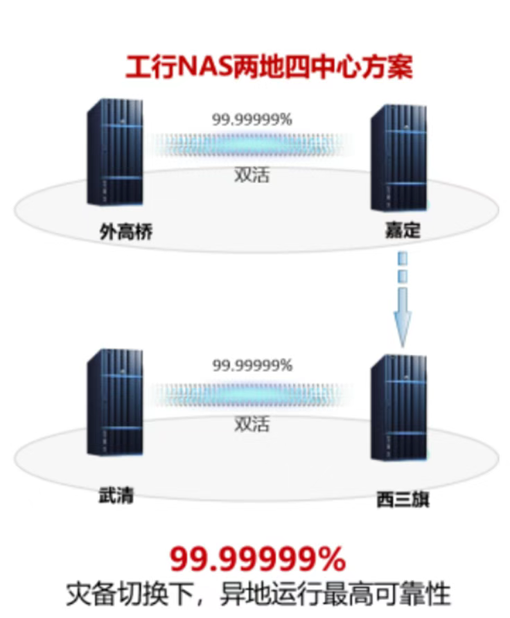 当前工行已经在外高桥、嘉定、西三旗部署了全闪存NAS存储组成两地三中心的解决方案,并承载了关基业务。需要业务无损平滑升级为两地四中心的解决方案。